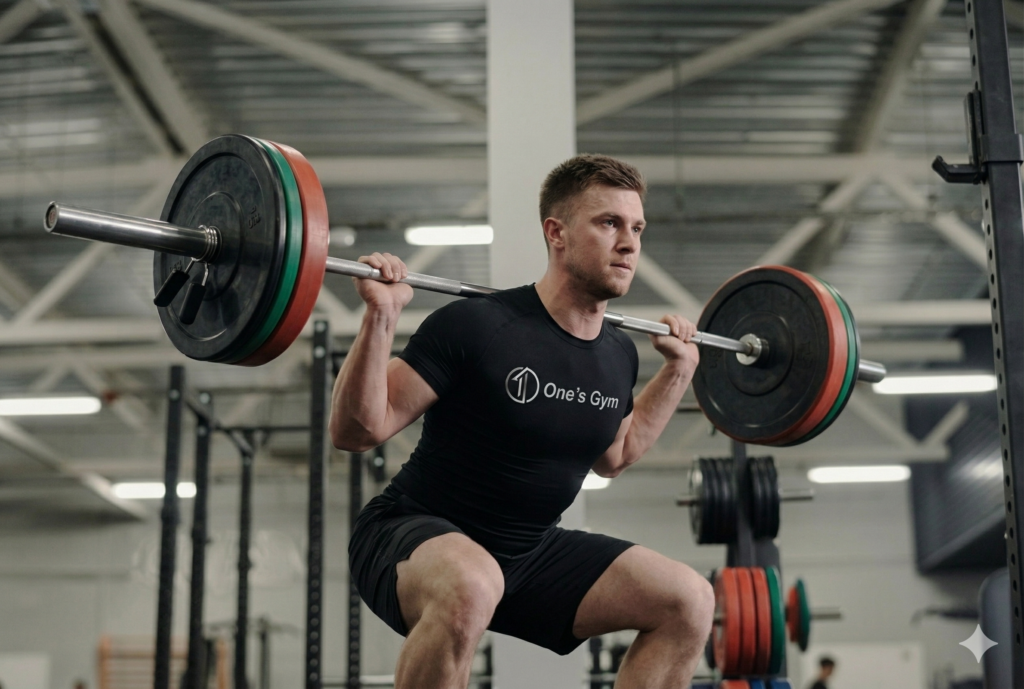 - バーベルを僧帽筋の上部(首の付け根あたり)に乗せる